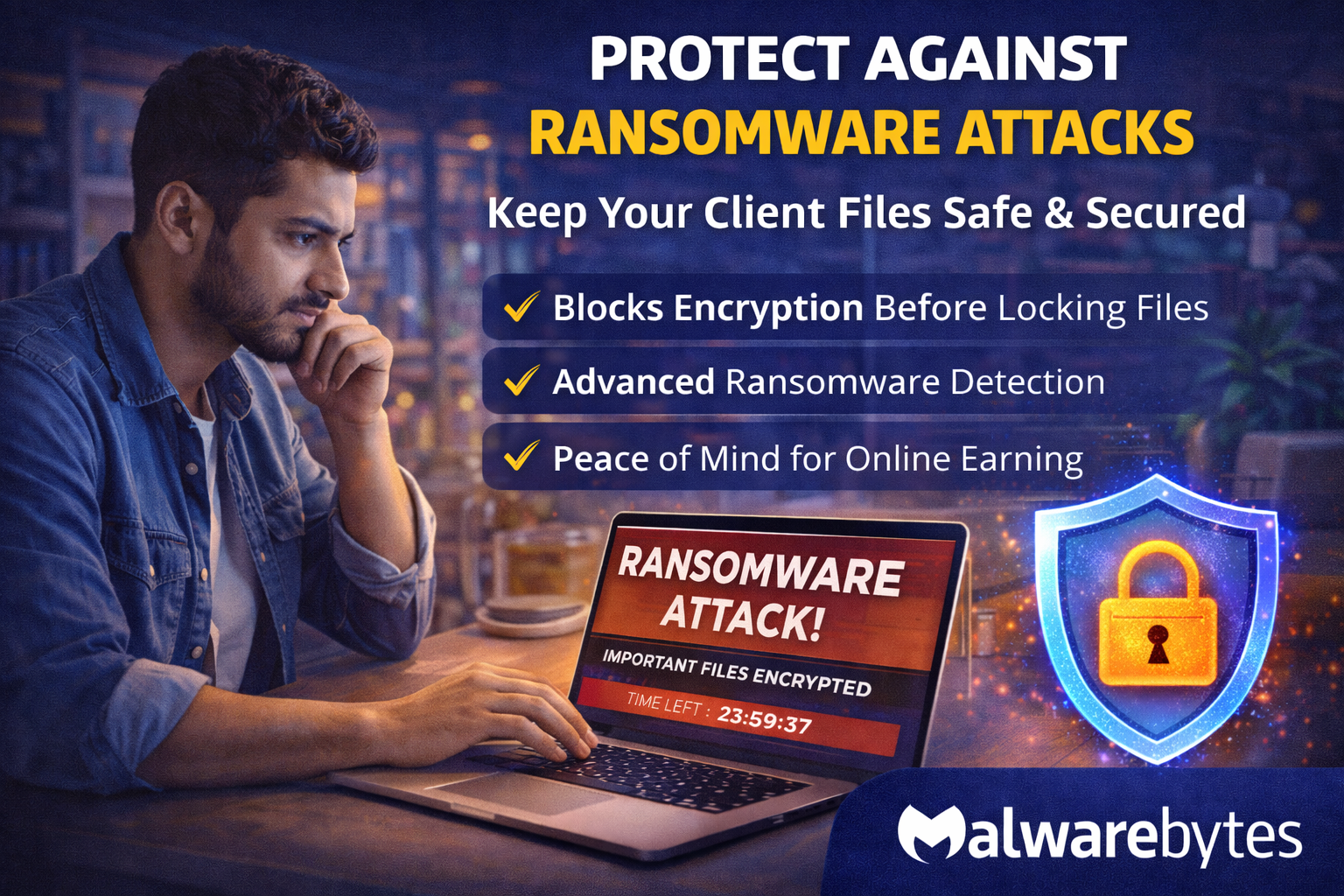 Ransomware is one of the biggest threats for online businesses. Malwarebytes monitors suspicious encryption behavior and blocks ransomware before files are locked.