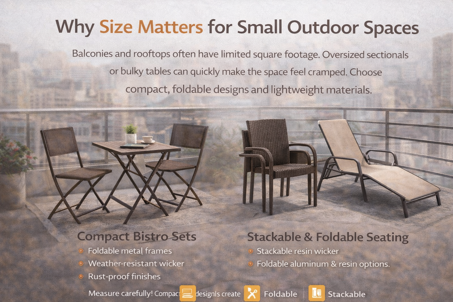 Stackable chairs or foldable loungers are ideal for flexible use. You can easily store them when not needed, making them perfect for compact balconies. Lightweight aluminum and resin wicker are popular materials due to their durability and resistance to outdoor elements.
