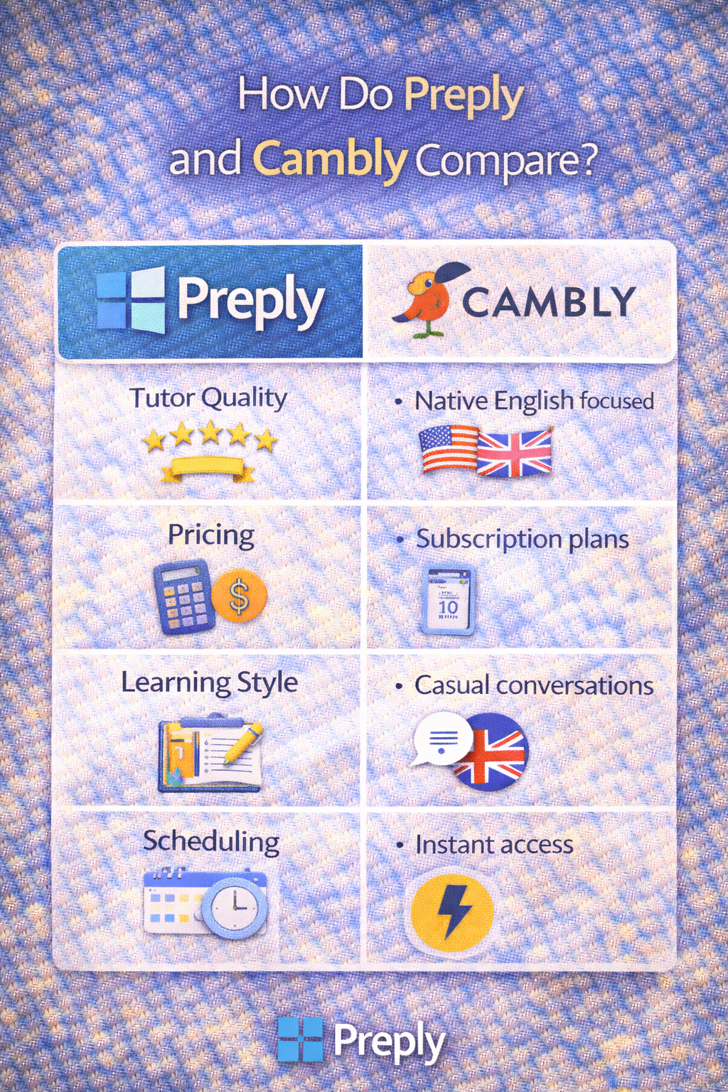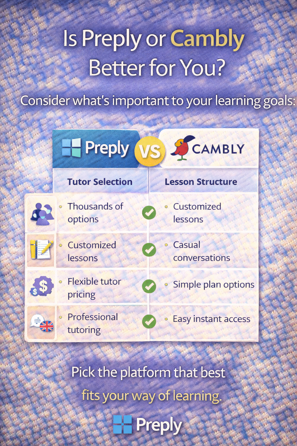 The choice between Preply and Cambly depends on your learning objectives.
