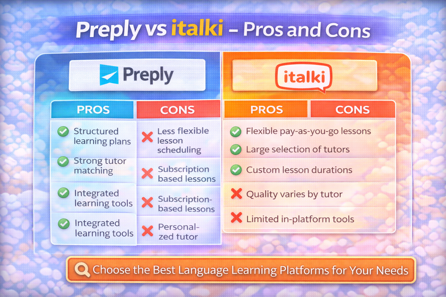 While both platforms help students improve language skills through personalized lessons, they differ in pricing models, lesson flexibility, and tutor structure. Understanding these differences can help you choose the right language learning platform for your needs.